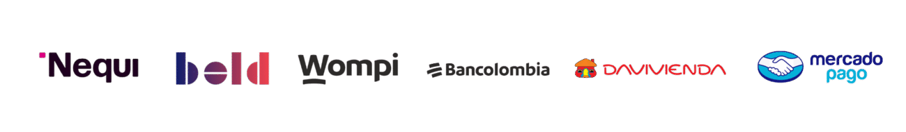 Contamos con aliados estratégicos como Nequi, Bold, Wompi, Bancolombia, Davivienda y Mercado Pago, garantizando transacciones ágiles, confiables y adaptadas a las necesidades de cada cliente.